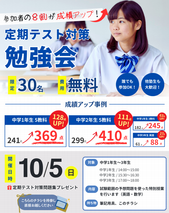 【参加者の8割が成績アップ! 中学生向け無料テスト対策講座 10/5(日)開催!】