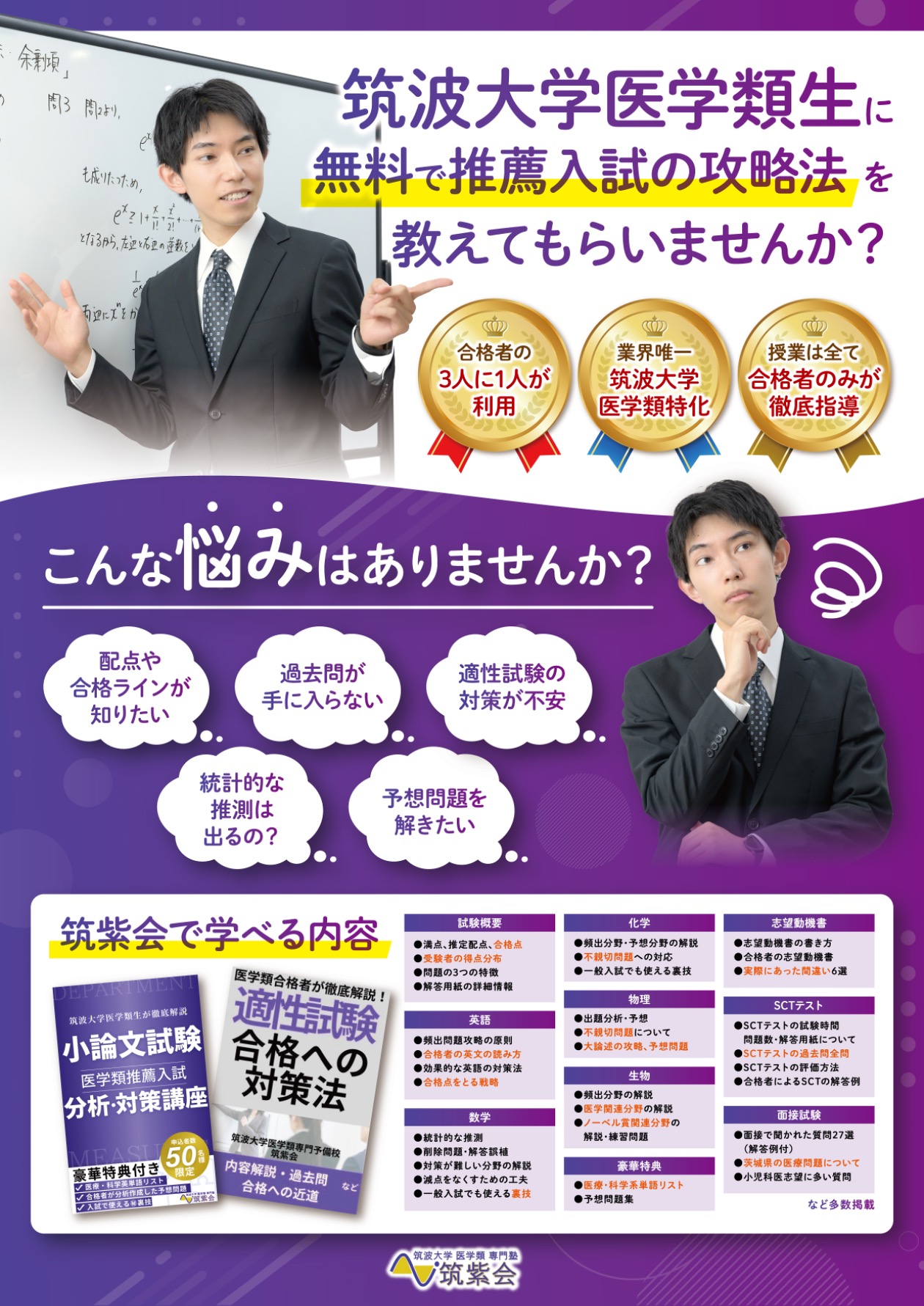 筑波大学医学群医学類の推薦入試は、推薦入試を筆頭に非常に特殊です。こういった試験問題の対策は一般の参考書だけでは難しく、特化した対策が必要です。希少疾患は大学病院などの専門機関で治療するように、筑波大学医学類の入試対策も専門的に行うべきだと考えます。