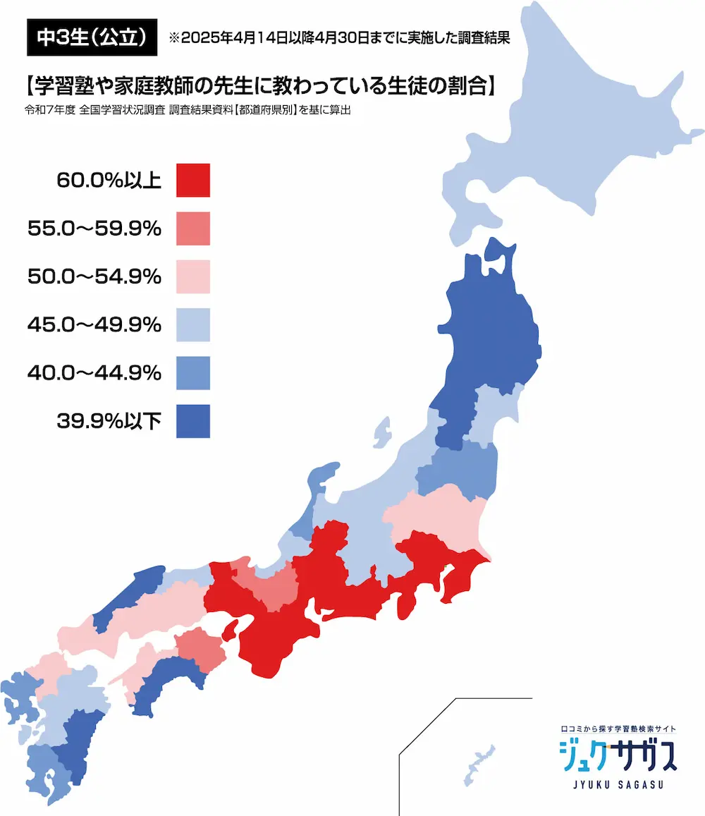 2025年4月14日以降4月30日までに実施された「令和7年度全国学力・学習状況調査」の調査結果資料【都道府県別】が2025年9月30日に発表されました。その中で特に気になるのが都道府県別の通塾率です。地域ごとに異なる通塾の実態は、子どもの教育環境選びにおいて重要な指標となります。本記事では、各都道府県の通塾率を詳しく分析します。