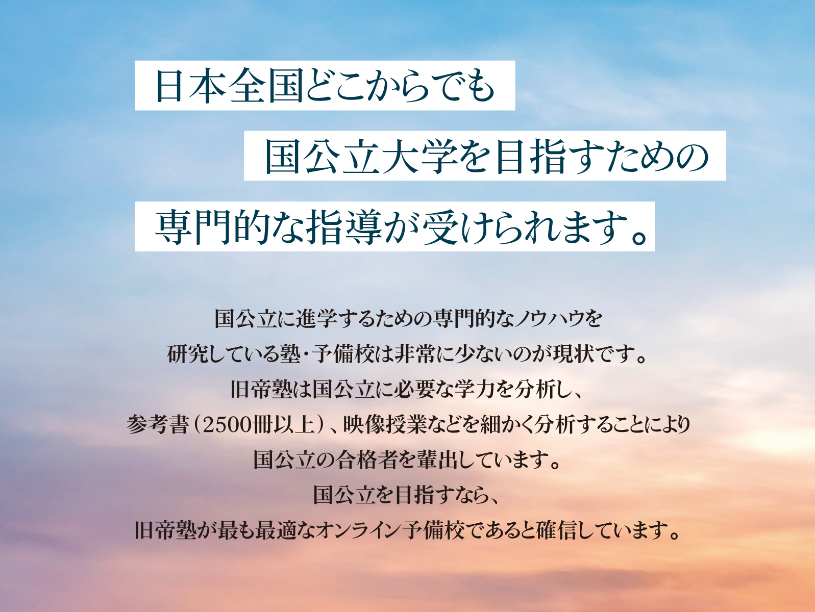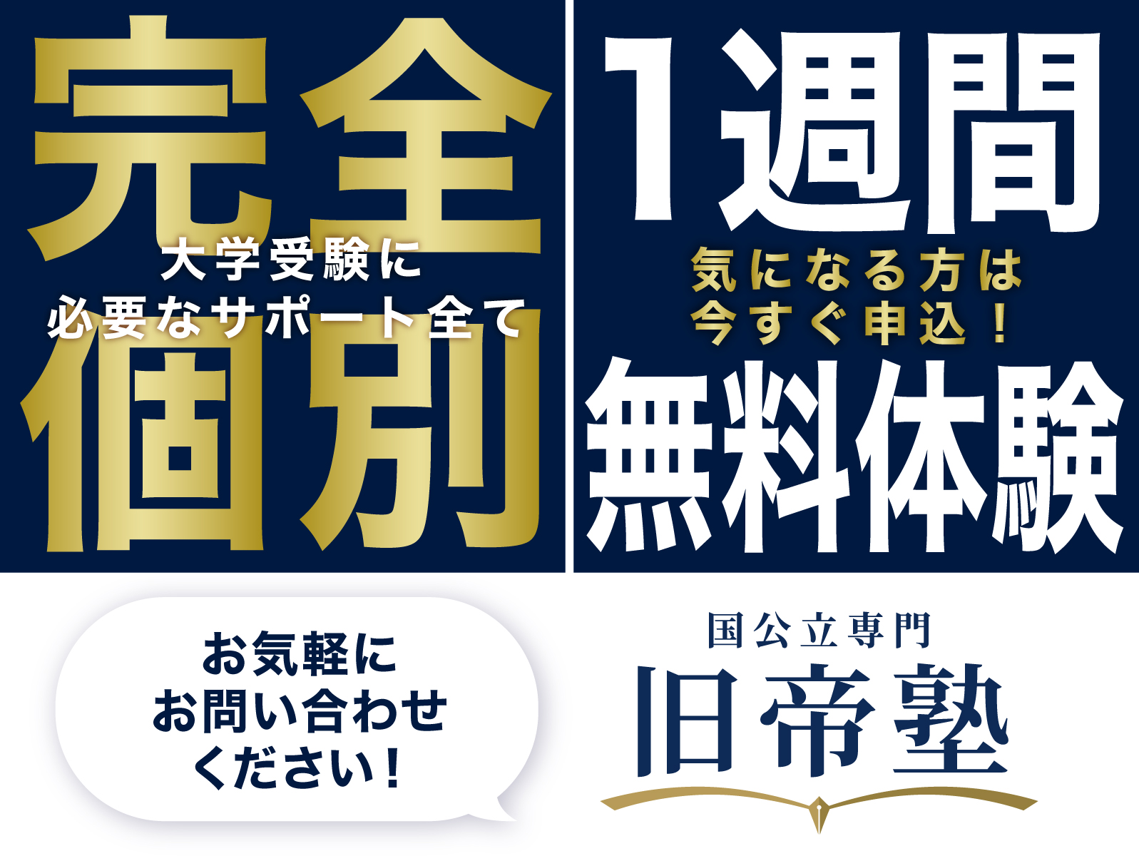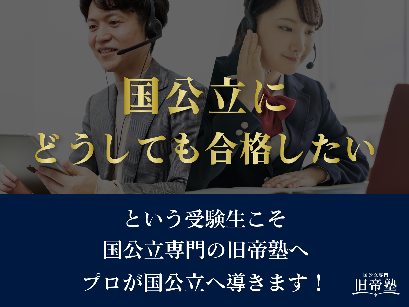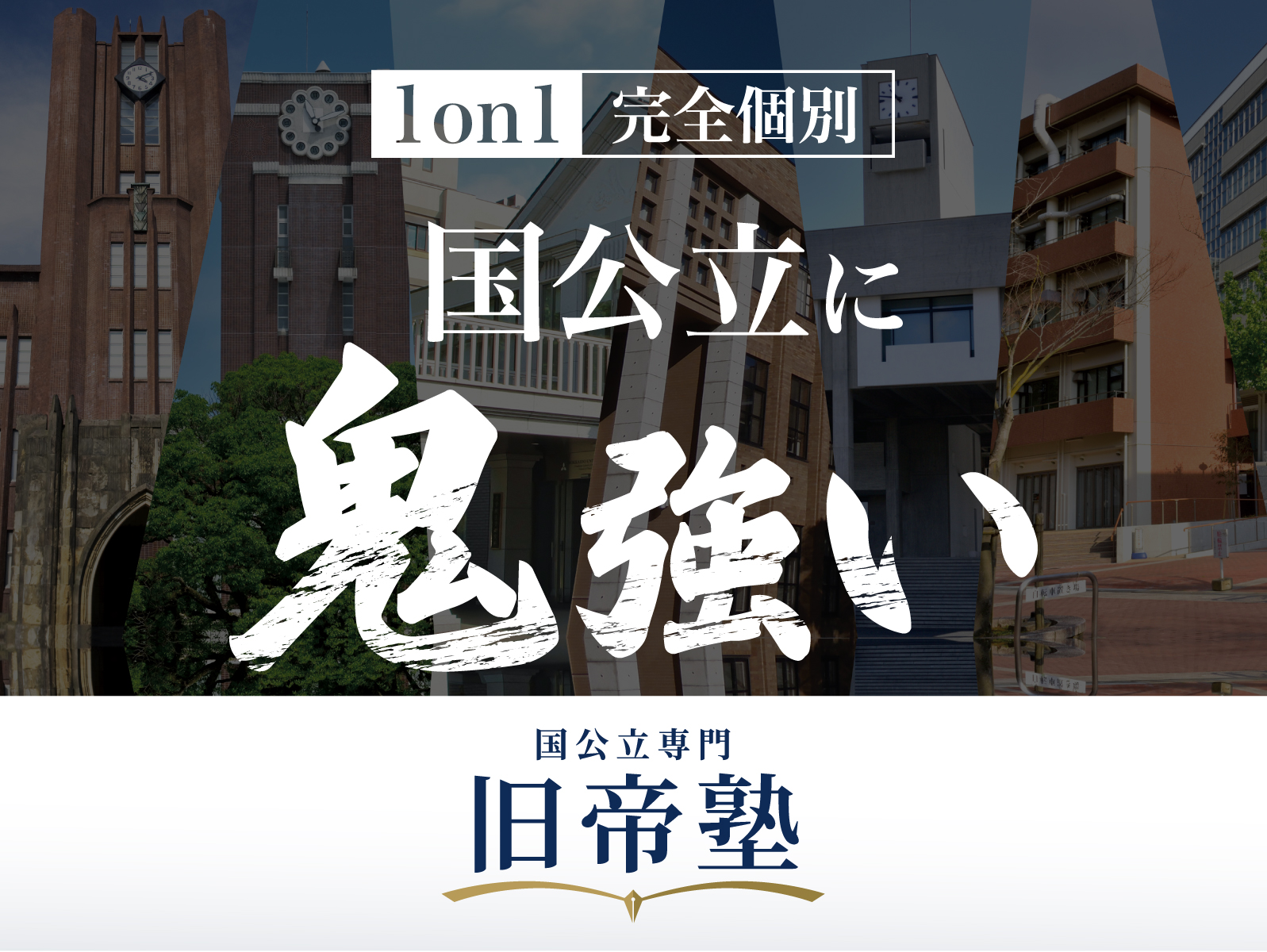 担任プロコーチ×少人数定員制の大学受験専門1on1個別予備校! だから、一般的な個別指導塾よりも完全個別の手厚いサポートができます! ※塾名は「旧帝塾」ですが、旧帝大以外の国公立や私立大学を目指す生徒も是非お問い合わせください。 <旧帝塾で志望校に合格できる理由> ◆担任プロコーチの1on1戦略授業◆ 旧帝...