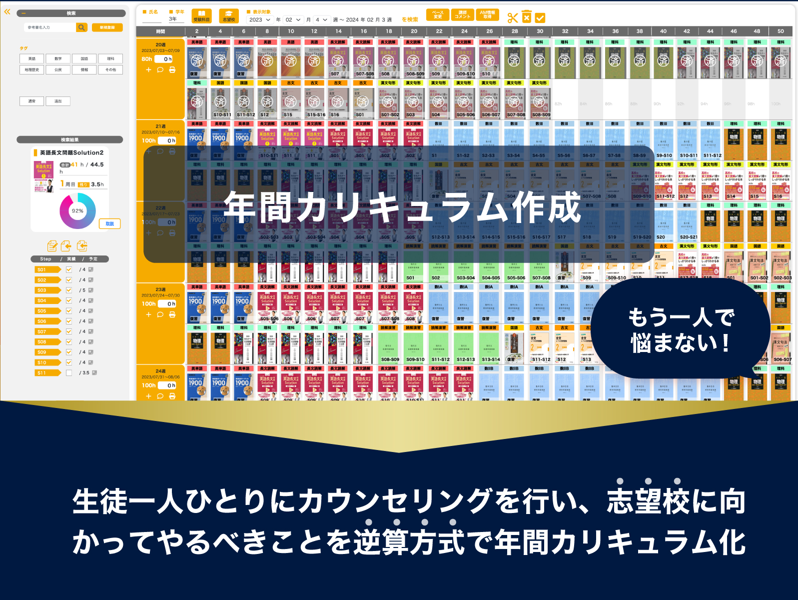 プロ講師による完全個別カリキュラム 生徒1人ひとりの学力や志望校に合わせたオーダーメイドの学習計画を作成し、プロ講師が完全マンツーマン指導で目標達成までサポートします! お互いの表情と手元を映しながら授業を行うため、対面指導と変わらないくらいスムーズなコミュニケーションが可能。オンラインなので全国ど...