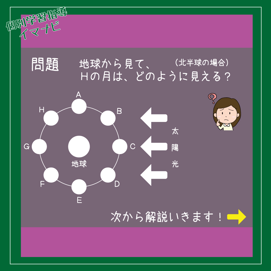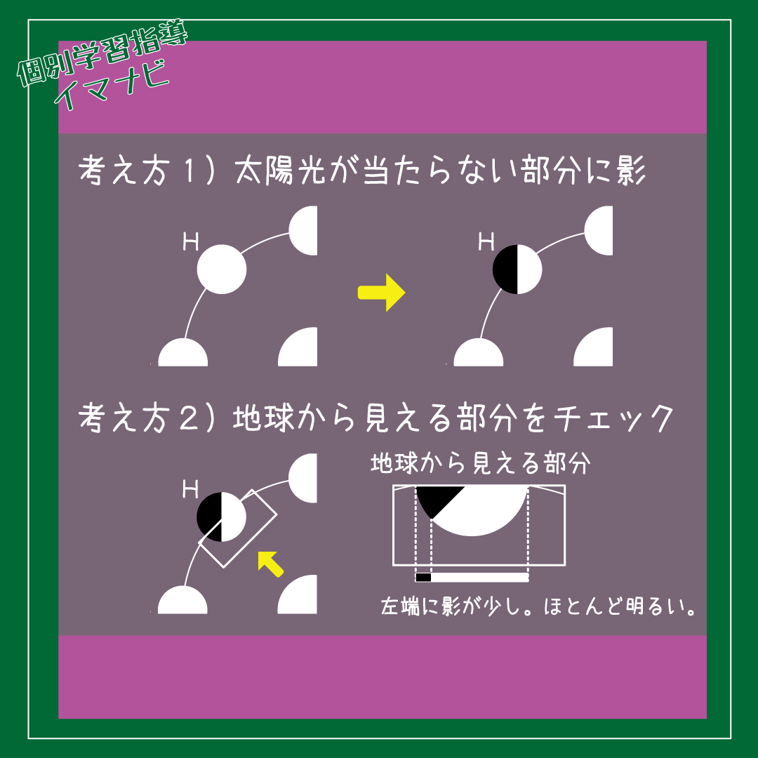 太陽の光の当たり方も地球からの見え方も垂直に考えて、前半分と後ろ半分に分けて判断するのがポイントです。