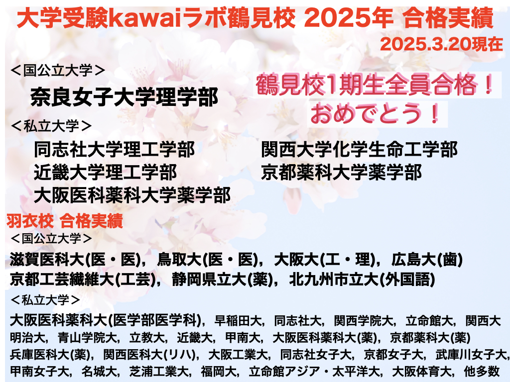 こんにちは,大学受験kawaiラボの河井です。2024年3月に開校した鶴見校は全員が合格を勝ち取り,また,1期生から国立大学の合格も出ました。いきなり始まった鶴見校の1年目としては上々のスタートを切れたと思います。