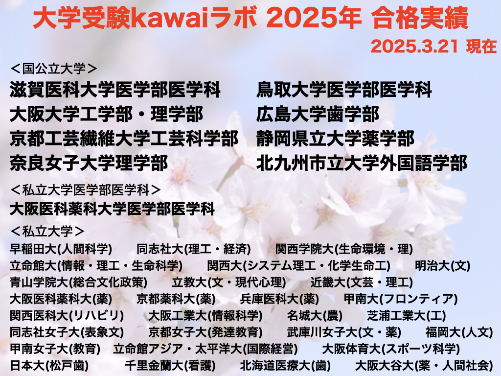こんにちは,大学受験kawaiラボの河井です。大学受験の合格発表も後期まできて,現時点で医学部医学科2名,大阪大学2名を含む9名の国公立大合格者,早稲田大,関関同立やGMARCHの一部,近畿大,私立薬学部にも合格者が出ており,この結果は塾の責任者が直接生徒を見る規模では最上級のものではないでしょうか。
