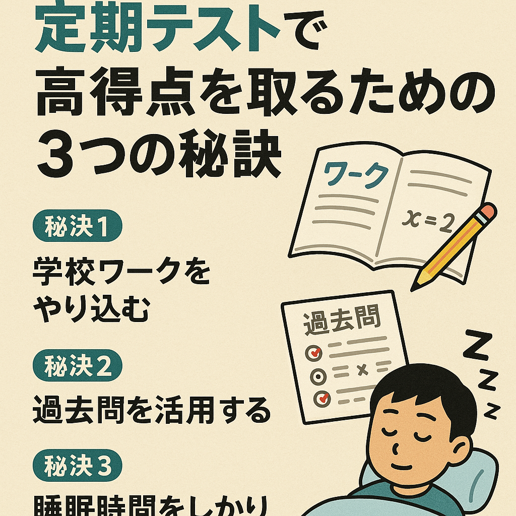まとめ 定期テストで高得点を取るためには、日々の学習の積み重ねが大切です。学校ワークを徹底的にやり込み、過去問を活用し、しっかりと睡眠時間を確保することで、目標点を目指しましょう。