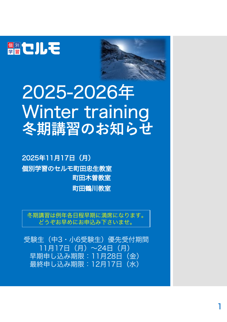 個別学習のセルモ町田では、今年も 2025-2026年「冬期講習」 の募集を開始いたしました。
