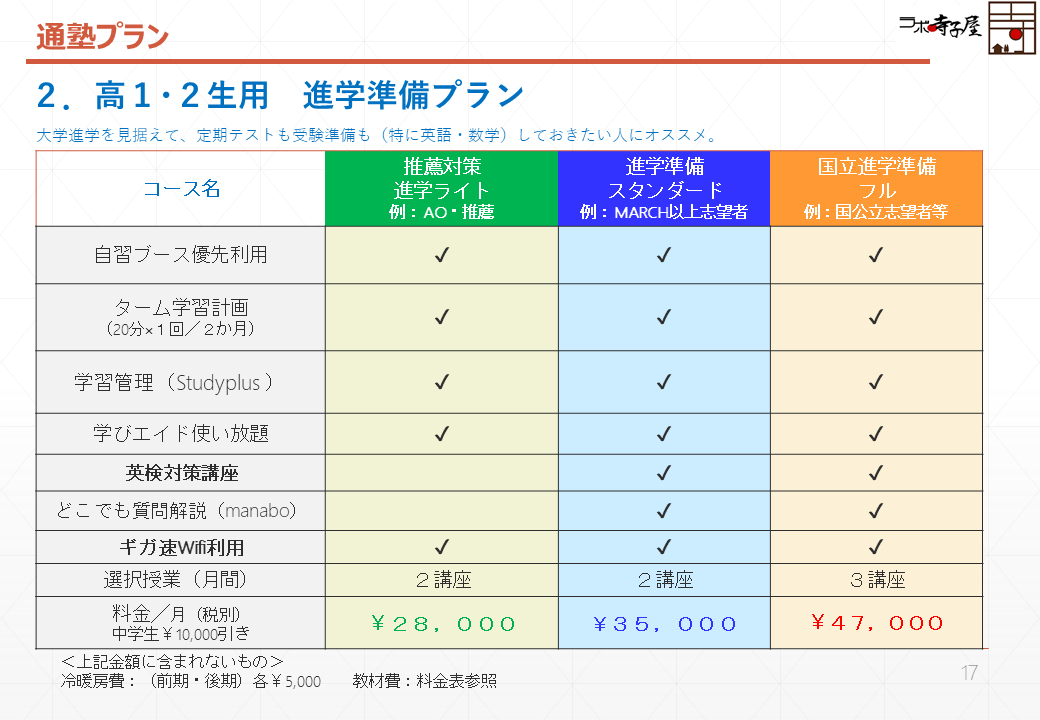 自習室教室が開いている時間には、いつでも利用可能です。高校生は365日プランがあります。