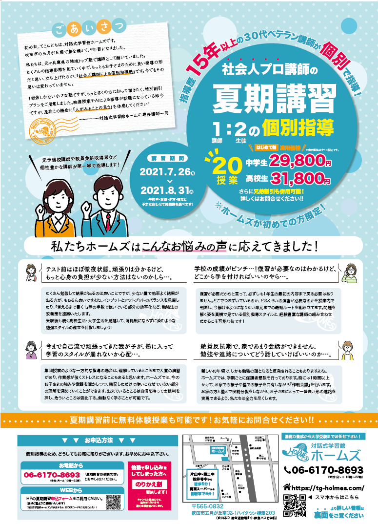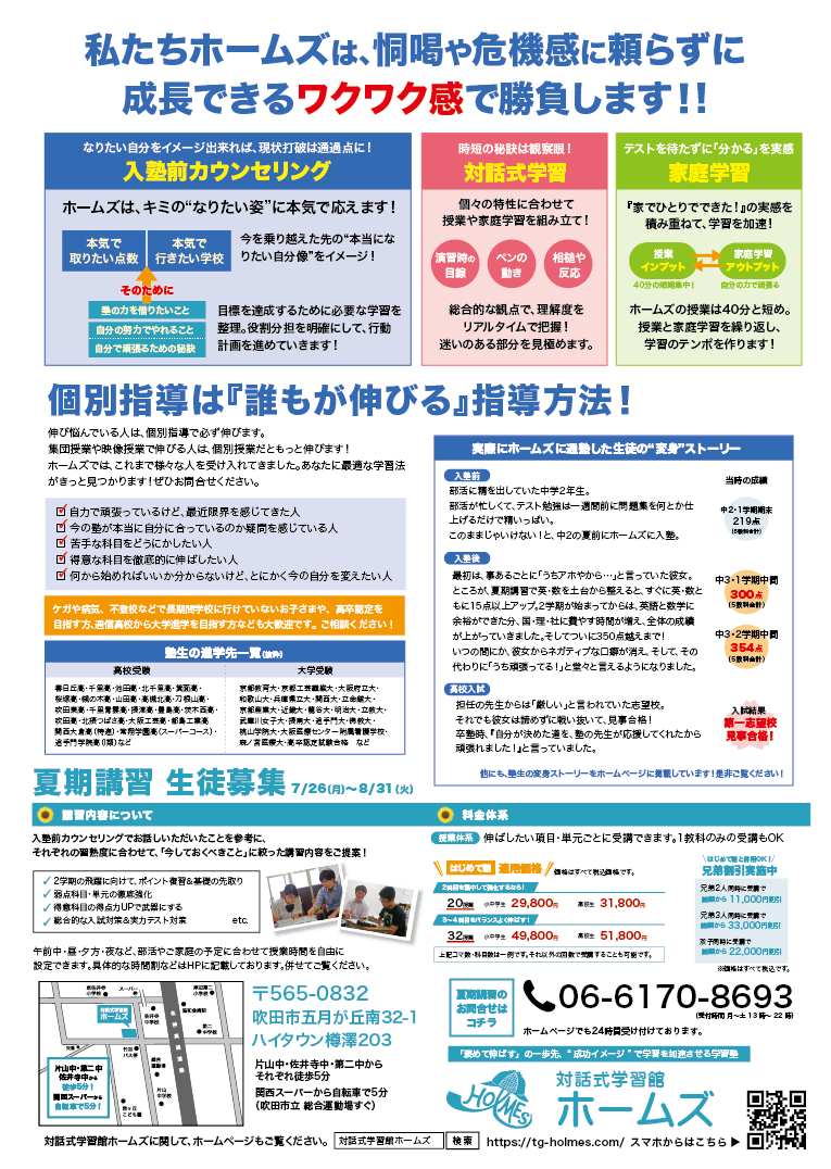 ホームズは日常から家庭学習の促進を行っている学習塾です。「平常授業は比較的安価だけど、講習費用が平常の10倍の価格になる個別指導塾」とは根本的に違う考え方をしているので、安心価格でご受講いただけます。