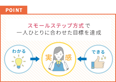 毎回の授業では、スモールステップ方式で一人ひとりに合わせた目標を達成し、「わかる!」「できる!」という実感を大切にしています。