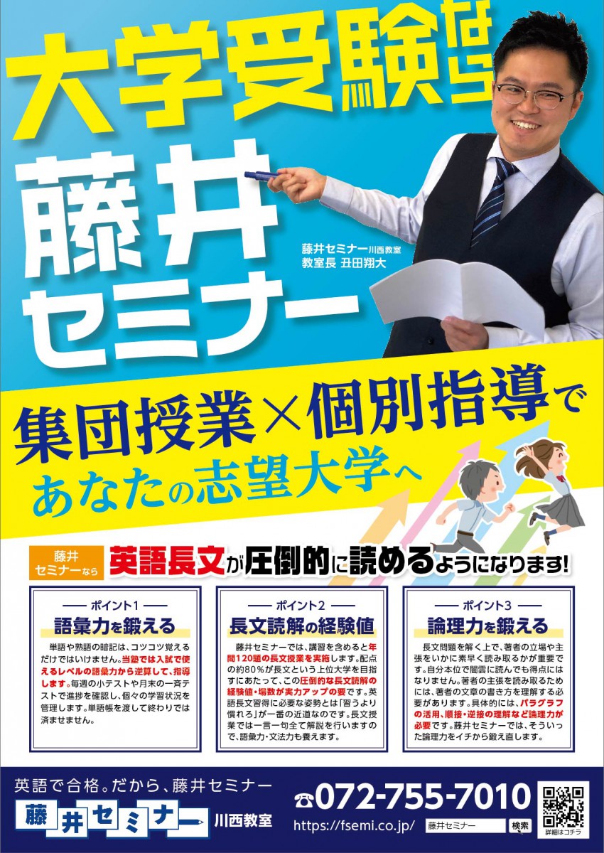 『英語で合格。 だから、藤井セミナー』 兵庫県川西市で20年、大学進学への指導をしています。英語が苦手な方は、藤井セミナーまで!