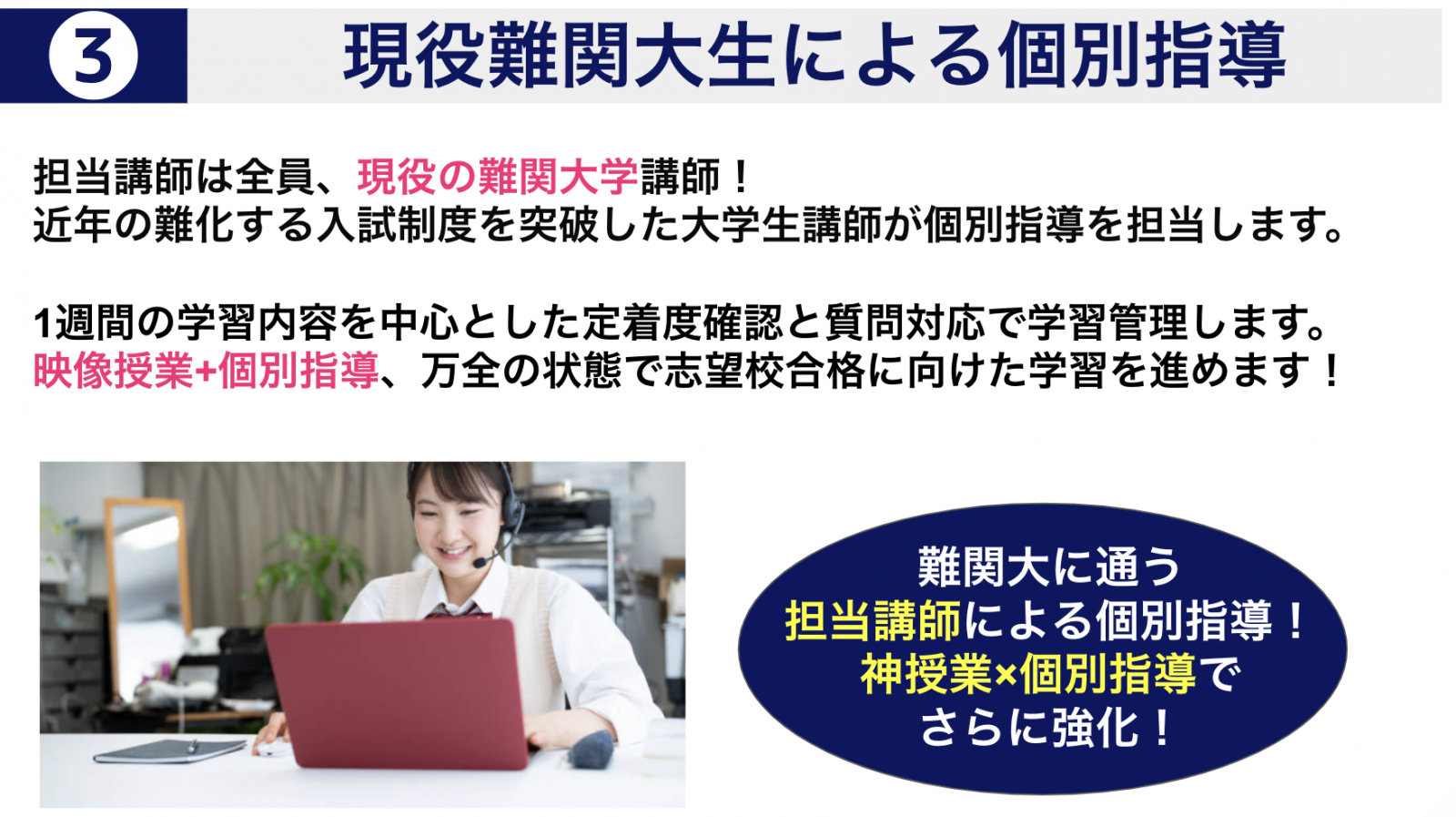 私立文系大学受験専門。毎授業後にプロ講師が面談し、出願戦略まで全プロセスを伴走する管理型オンライン塾。総合型選抜入試両立コースも開講中