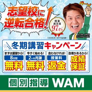 個別指導WAMで成績が上がる7つの理由 1 地域密着のWAMだから学校のテスト対策はお任せください! 「5教科190点から400点にアップ!!」 「苦手科目が、35点から90点に上がった!!」 「無理と言われていた大学に逆転合格!!」 WAMでは、このような結果が当たり前のように起きています。私たちWAMは、ただの個別指導...