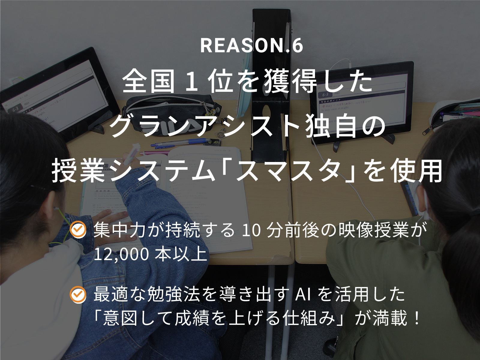 小さな成功体験を積み上げて、大きな成果を作り上げましょう! グランアシストでは、効果的な最新の指導方法を取り入れ、 教育に関する最新の情報をご提供しています。 また、日々の授業では、ティーチングとコーチングのスキルを駆使し、 「目標の設定」「結果の追求」「次への課題発見」をサポートします。 オンライ...