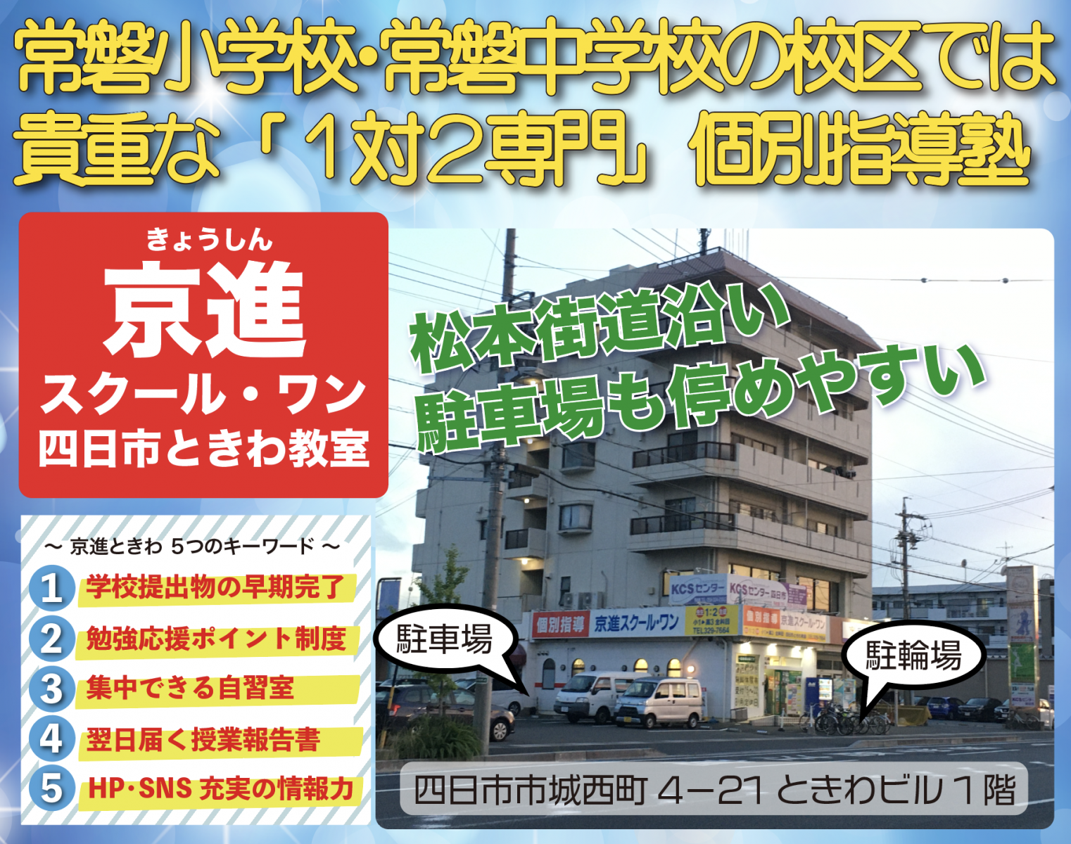 四日市市松本街道沿い、常磐・松本地区の1対2完全個別指導塾と言えば京進!