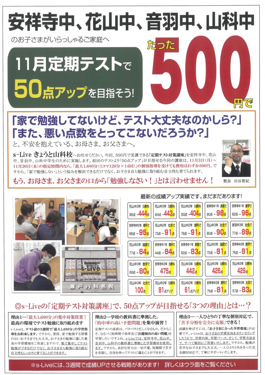 s-Liveきょうと山科校 - 理想の学習スタイルがここに s-Liveきょうと山科校は、個別指導塾として、学生たちに本当の学力を身につける手助けを提供しています。 私たちは、今までになかった理想の学習スタイルをご提案し、生徒自身が自立し、自ら学習する姿勢を育てることを重要視しています。生徒のやる気と、一人ひとり...