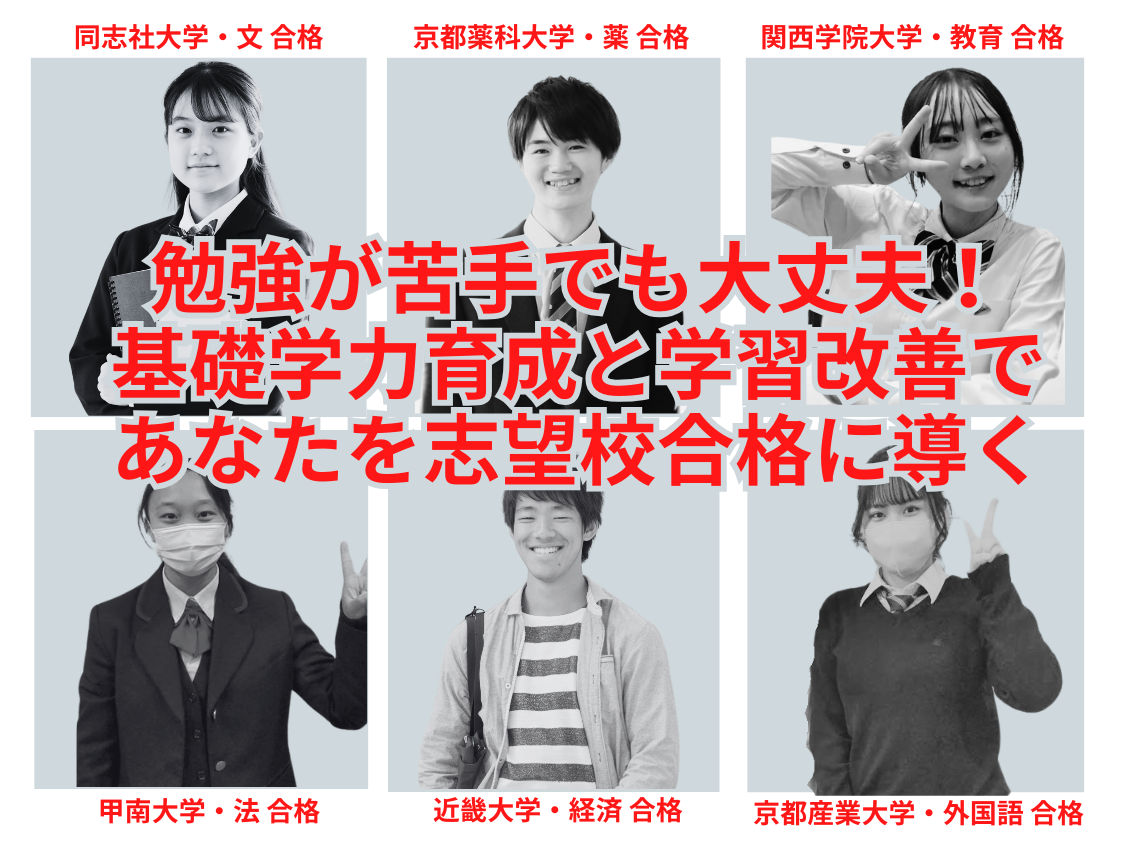 私たちは、一人ひとりにあった勉強方法をご提案し、それを実践し、身につけていくサポートをします。これまで「学習塾」や「通信教材」を試したけど、成績が上がらなかった方、今からがんばりたい方、ぜひ、私たちと一緒にがんばりましょう!!
