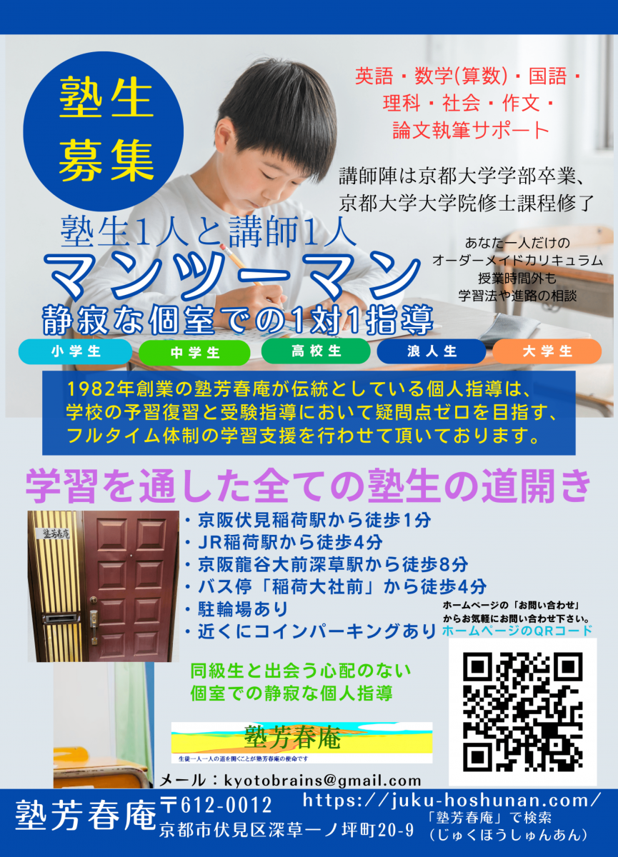京都市、伏見稲荷大社すぐ近く(深草)の個人指導(1対1個別指導)マンツーマン塾です。 1982年(昭和57年)創立以来、学習を手段として生徒一人一人の道を開くことの手助けをすることを目標としてきました。 塾芳春庵は、小学生・中学生・高校生・浪人生・大学生・大学院生・社会人の方々の、予習復習・中学受験・高校受験...